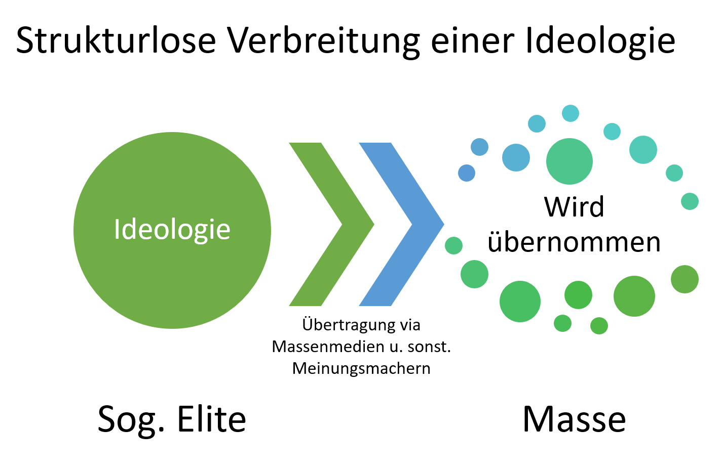 The graphic shows how an ideology is adopted by the masses even though there is no command, simply because it is repeated over and over and over again through the media, schools, churches, etc.